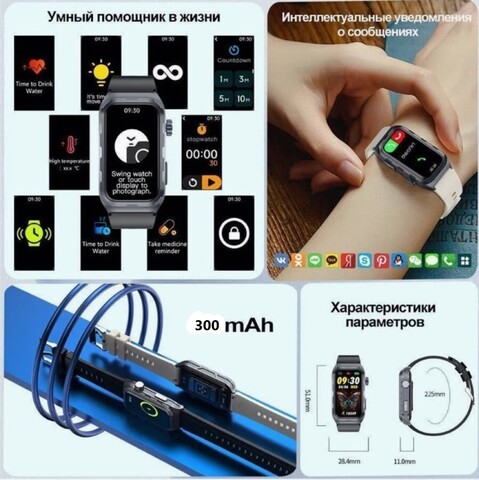 Женское здоровье, тренировка дыхания, напоминание о высокой температуре тела, напоминание о высоком пульсе, напоминание о сообщении, секундомер, обратный отсчет, подсчет шагов, калории, расстояние, режим упражнений, напоминание о вызове, напоминание о тревоге, напоминание о сидении, поднятие руки для освещения экрана, тряска и фотосъемка, управление музыкой, напоминание о питьевой воде, напоминание о лекарствах